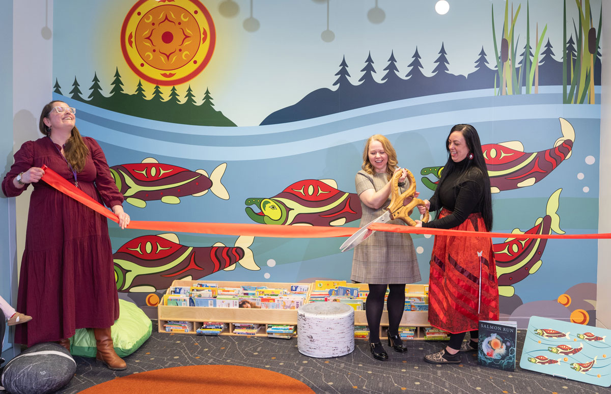 Fackrell, one of the artists behind KCLS’ new library card designs,, opens a new window designed the kids space mural using traditional Salish patterns in a contemporary way. The new mural reflects and honors the journey of the Kokanee salmon through Pacific Northwest waters. Surrounding the space are fun furniture additions of cushy logs, stumps, and rocks that become natural shelters for salmon in the wild as they make their long journey back to their spawning grounds.